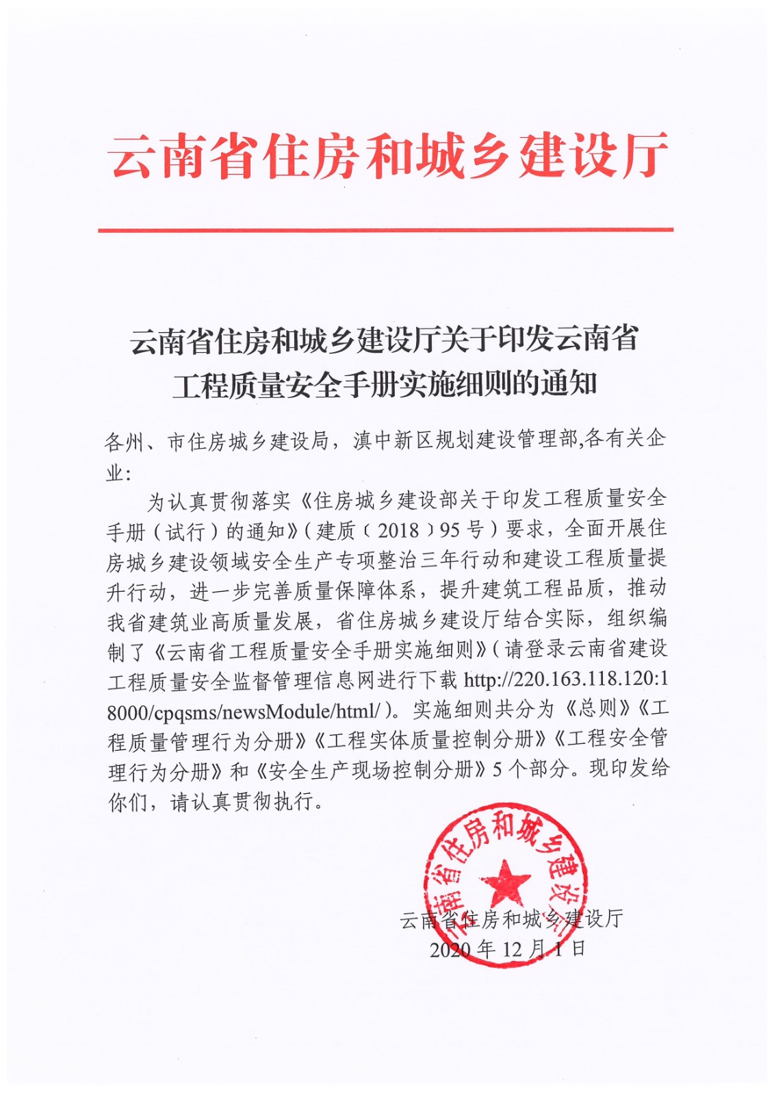 云南省住房和城鄉(xiāng)建設廳關于印發(fā)云南省工程質(zhì)量安全手冊實施細則的通知